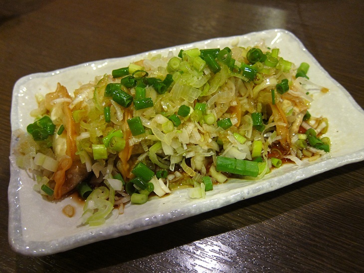 揚げた餃子にネギたっぷり、これにポン酢だったかと記憶しています。焼鳥2軒目で酔ってましたから違ったらすみません(笑)