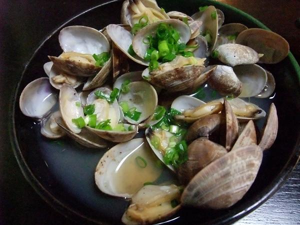 お通し、モツ煮、から揚げ、ハマグリの酒蒸し