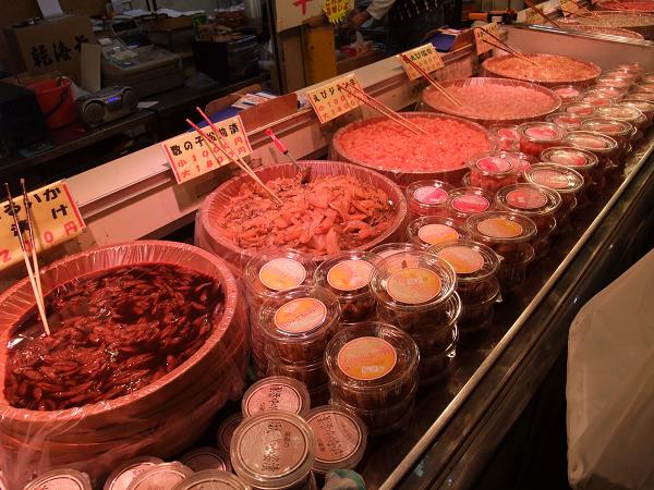 冷凍マグロ、鰹節、かまぼこ、伊達巻、塩辛、たこわさび、ホタルイカ、