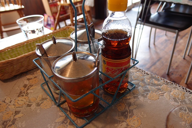 そこでタイ料理の調味料が登場します。唐辛子、酢、ナンプラーをお好み量を入れて食べます。