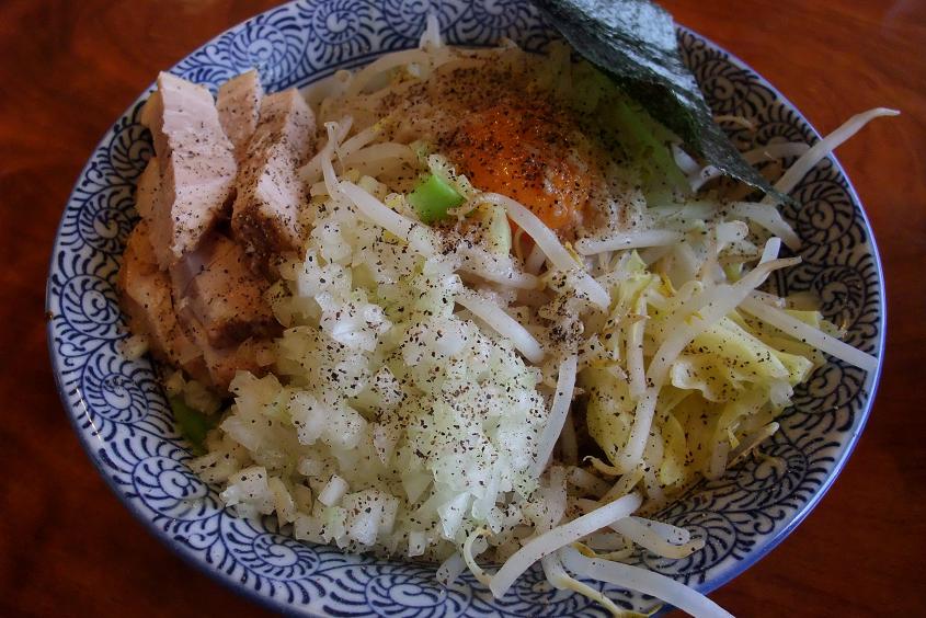 トッピングは、刻んだチャーシュー、黄卵、モヤシ、キャベツ、海苔、