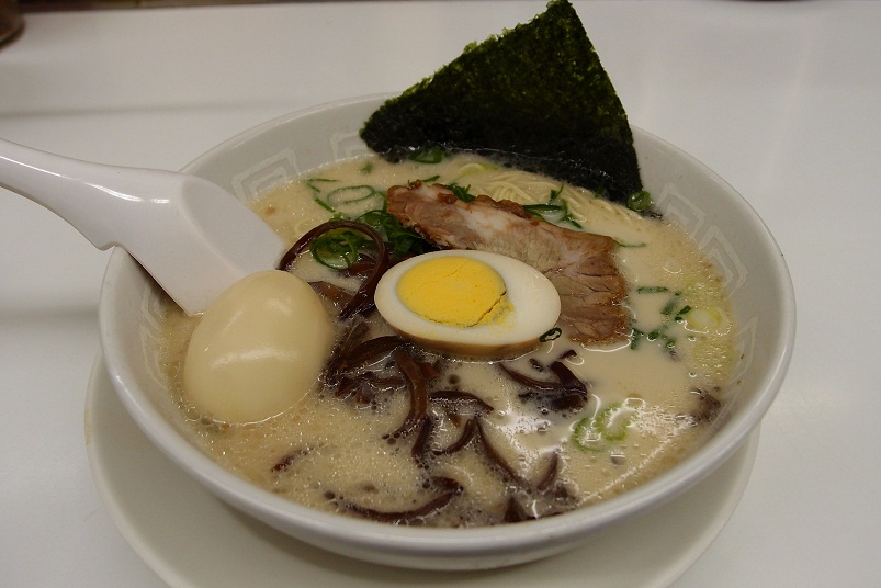 チャーシュー、半味玉、キクラゲ、海苔、青ネギの載った博多ラーメンです。