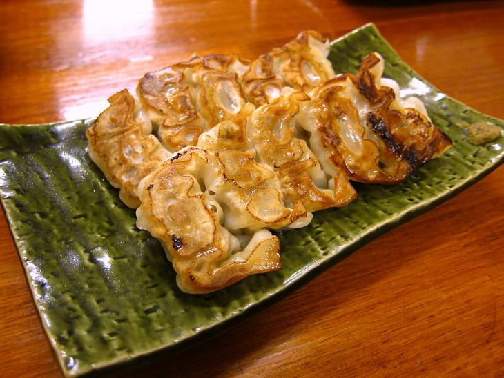小ぶりの餃子ですが一皿10個入りです。お皿の隅に柚子胡椒が載っています。黒豚を使った餃子で、とてもジューシーでした。