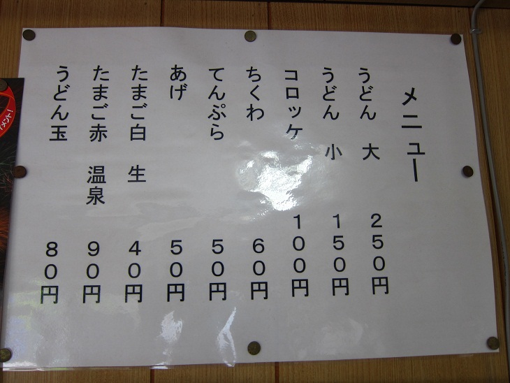 うどん小150円、うどん大250円、ちくわ60円、てんぷら50円、あげ50円、生卵40円、温玉90円・・・価格は安いです!