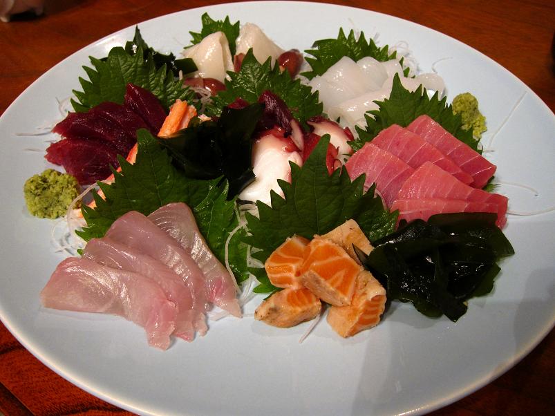 刺身の盛り合せです。マグロ中トロ、赤身、サーモン、タコ、イカ、エンガワ、ホタルイカ・・・。