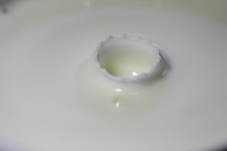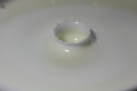 約20cmくらいの位置からブルガリアのむヨーグルトの入った皿に落下させます。