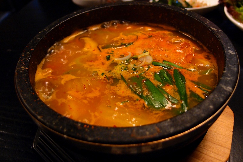 カルビスープに、ご飯と赤い麺が入ったような料理です。石焼の器に入ってグツグツしながら熱々で登場しました。