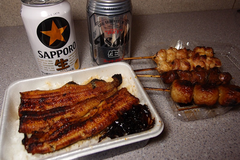 散歩していて見つけたお店。外の売店で炭火でウナギと焼鳥を焼いています。