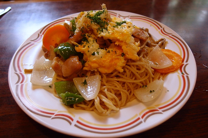 トップに玉子がのった野菜と鶏肉の入った炒めパスタです。