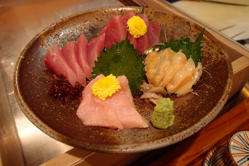 新鮮で美味しい刺身。カツオ、マグロ、アワビ、あとひとつはイナダなのか?覚えてませんがw