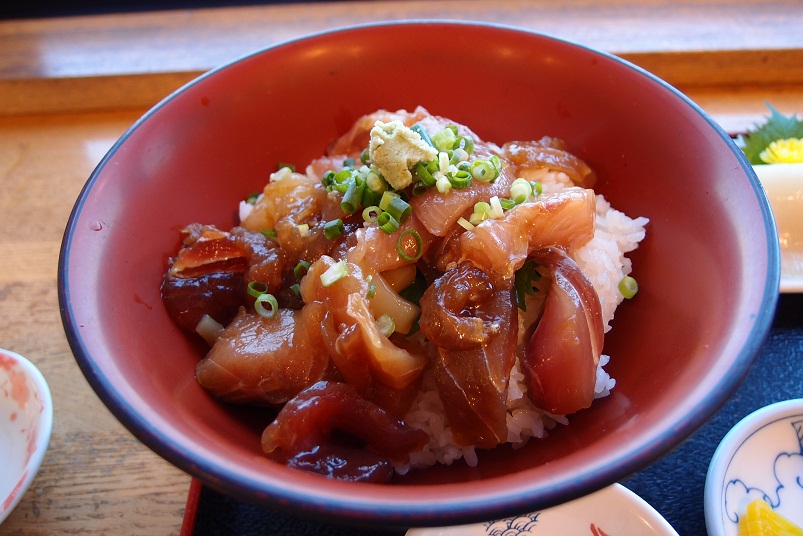 マグロ、ブリ、イカ・・・その他確認できない魚たちの切れ端の漬けがたくさんのっています。