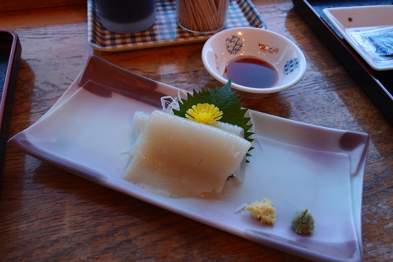 飾りの菊は樹脂製でしたが、新鮮で美味しいイカ刺しでした。