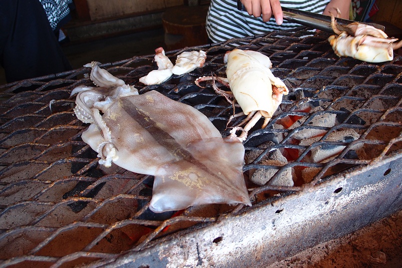 すると現れたのは、ずらりと並ぶ焼きイカのお店が数軒。もう、寄るしかないでしょう(笑)