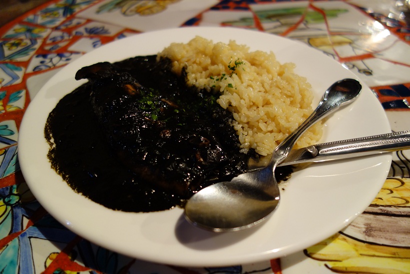 真っ黒なソースの中にはイカが横たわっています。真っ黒で全然見えませんが(笑)
