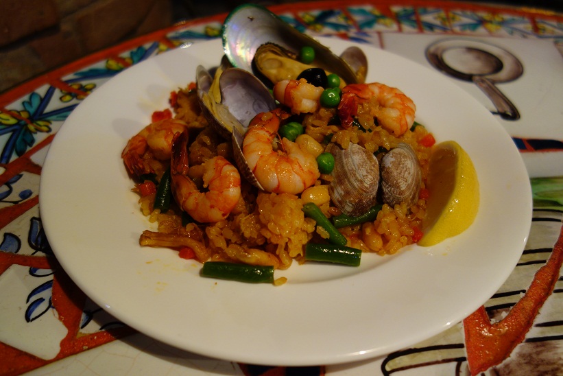 アサリ、海老、ムール貝、鶏肉、エンドウ、白豆のパエリア。