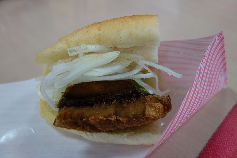ハーフサイズのパンにサバの竜田揚げ、レタス、オニオンスライスがサンドされています。