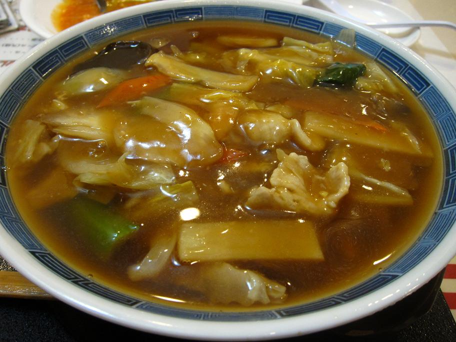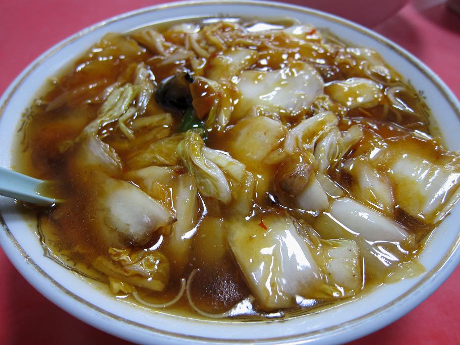 餡かけです。餡かけに鷹の爪が入っていて、わりと辛口です。