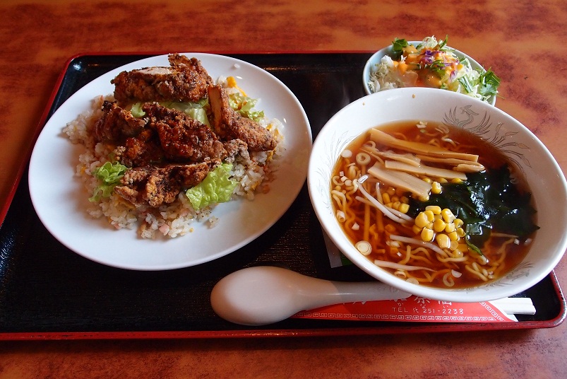 カラアゲの載ったチャーハンとラーメンのセットです。