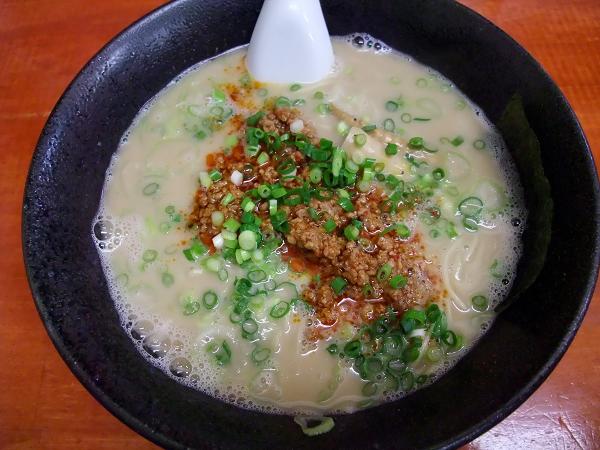 豚骨ラーメンの上に挽肉、ヒメタケ、ネギが載った担々麺です。