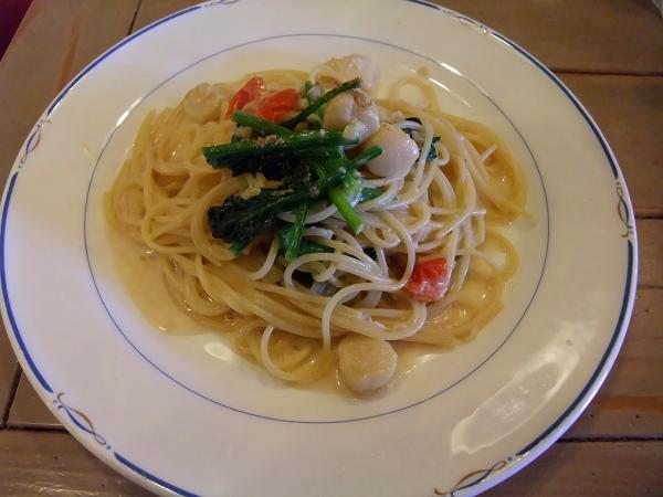 小ぶりの貝柱が入ったクリームパスタです。