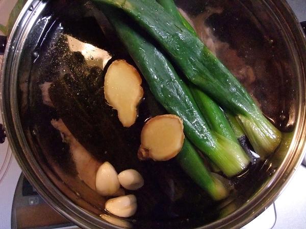 材料は鶏ガラ4羽分、ゲンコツ2本、生姜、ニンニク、ネギ、昆布
