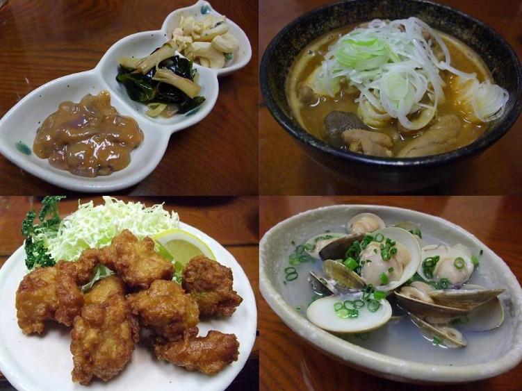 お通し、モツ煮、から揚げ、ハマグリの酒蒸し