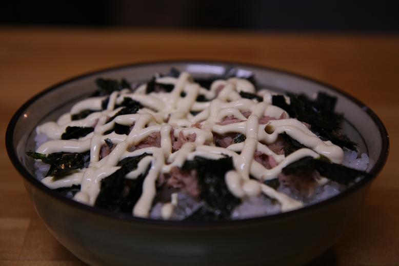 酢飯の上中央に ツナ をのせて、周りに千切った海苔を乗せます。