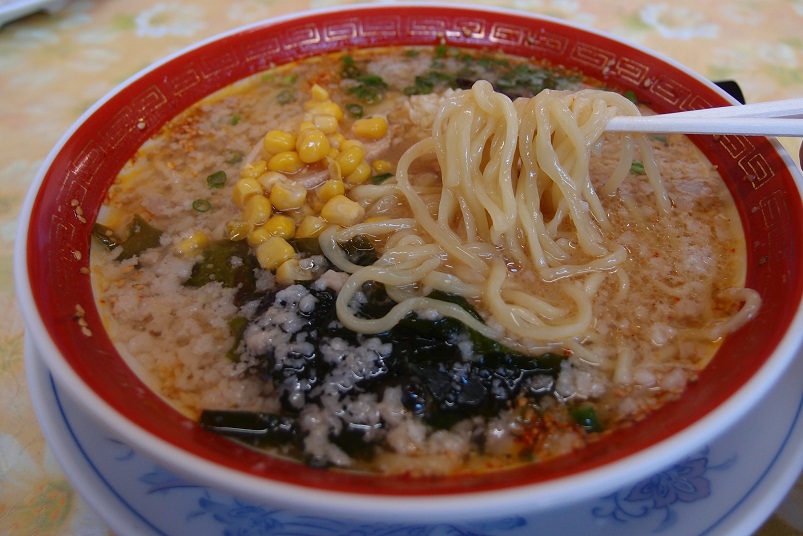 トッピングはチャーシュー、ワカメ、コーン、ネギ。チャーシューはモモ肉でしたが意外と柔らかくていい感じでした。