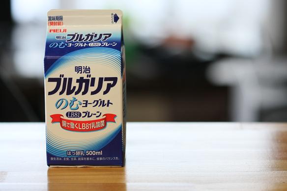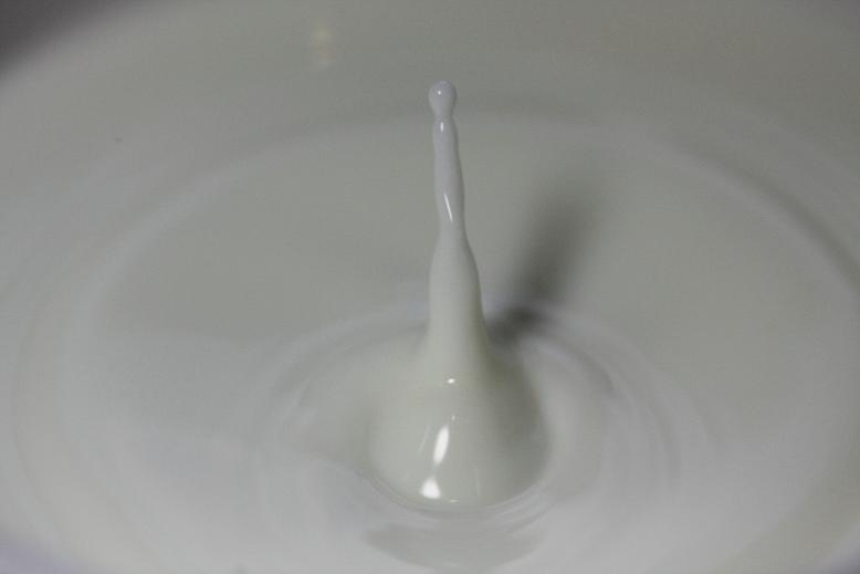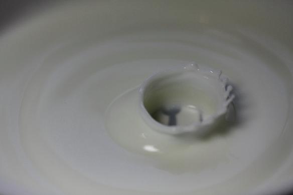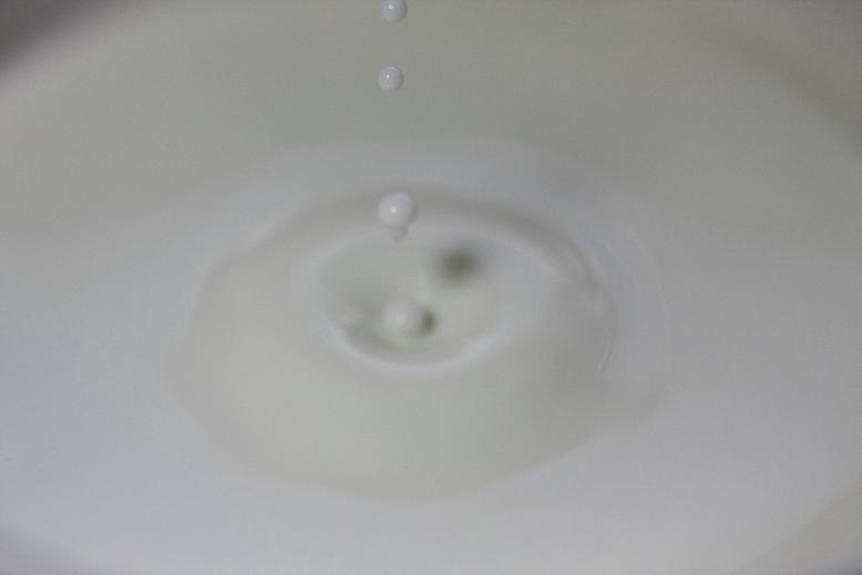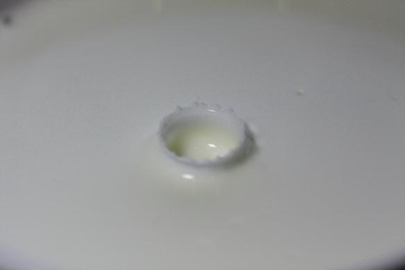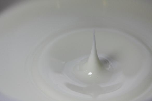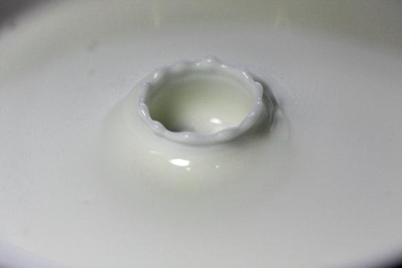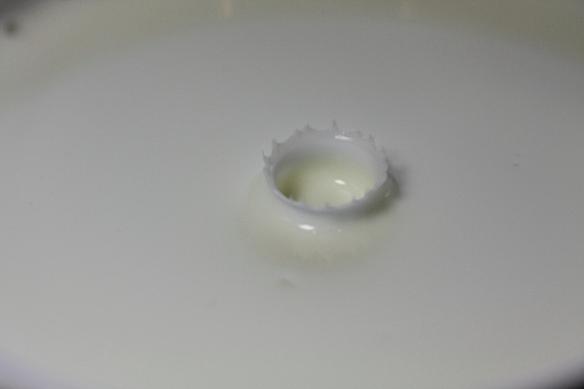 約20cmくらいの位置からブルガリアのむヨーグルトの入った皿に落下させます。