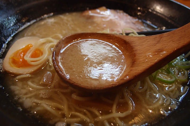 スープは背脂が浮いたライトで甘味を感じる豚骨スープです。ただし、しょっぱい(笑)