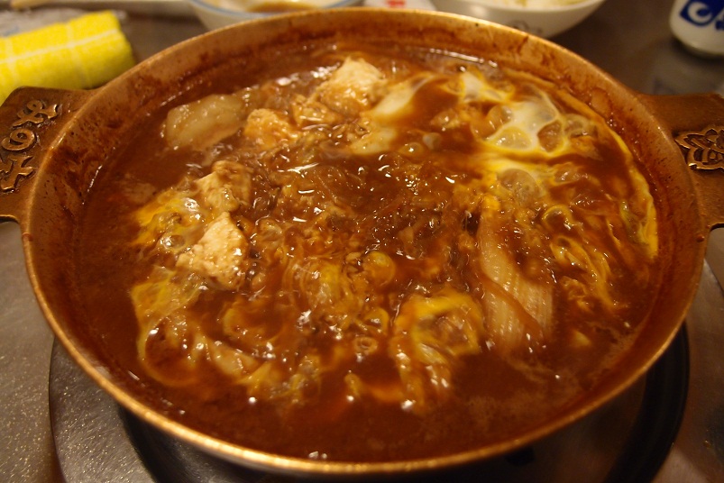 鍋に生卵を落としてタレと絡めて半熟状態に、これを御飯の上にのせて頂きました。