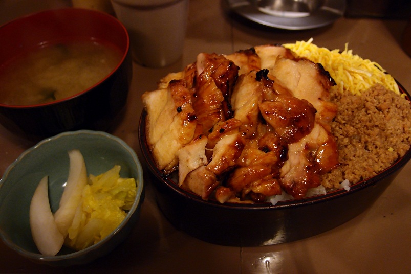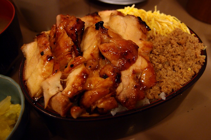 香ばしく焼かれた鶏モモ肉の横には、そぼろと金糸玉子も載っています。
