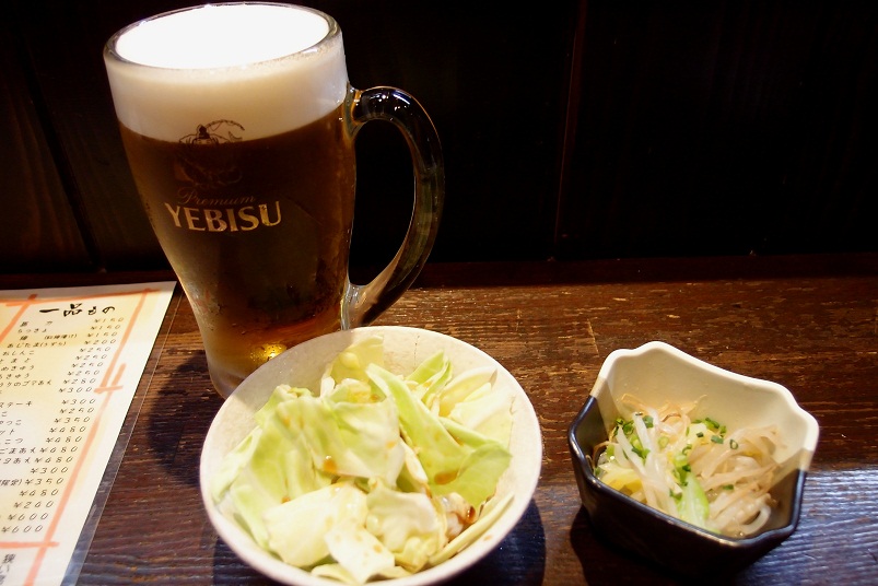 まずは生中。お通しとサービスのキャベツが出てきました。