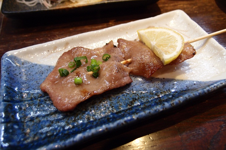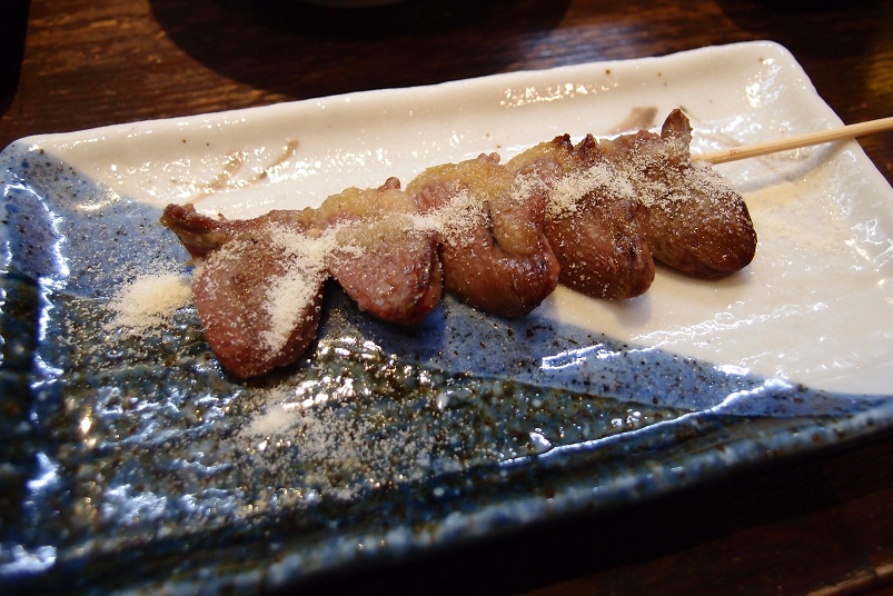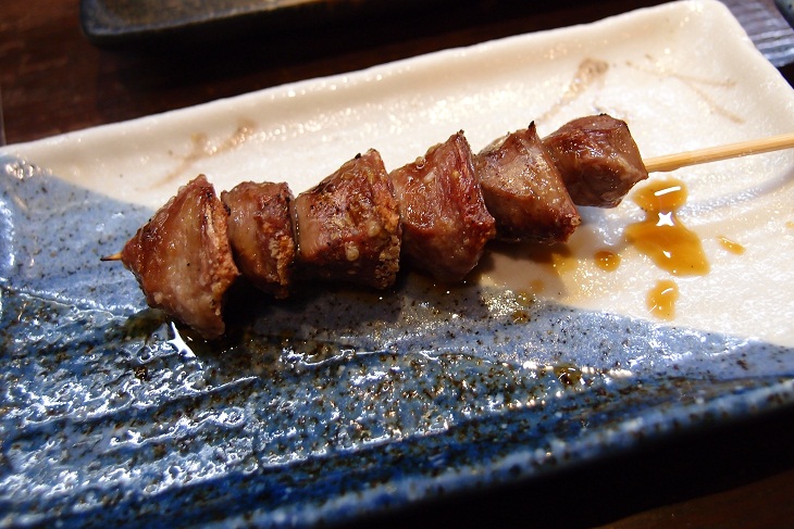 牛タン、つくね、み(もも肉)、こころガーリック、ずりポンが1本ずつ焼かれて出てきます。