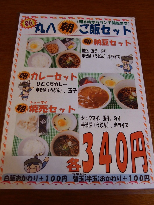 朝定食は納豆セット、カレーセット、シューマイセットの3種類で、半そばor半うどんが付いて340円。