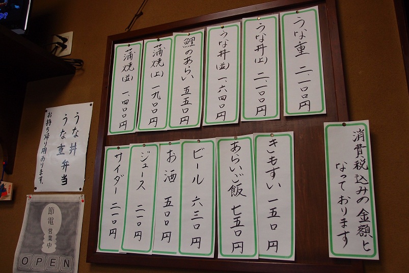 メニューは、うな重、うな丼上・並、蒲焼上・並、鯉のあらい、あらい御飯、肝吸・・・。