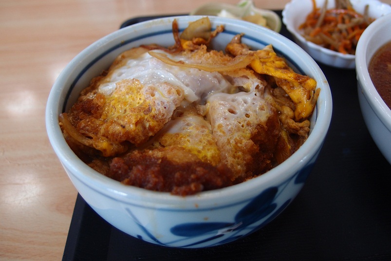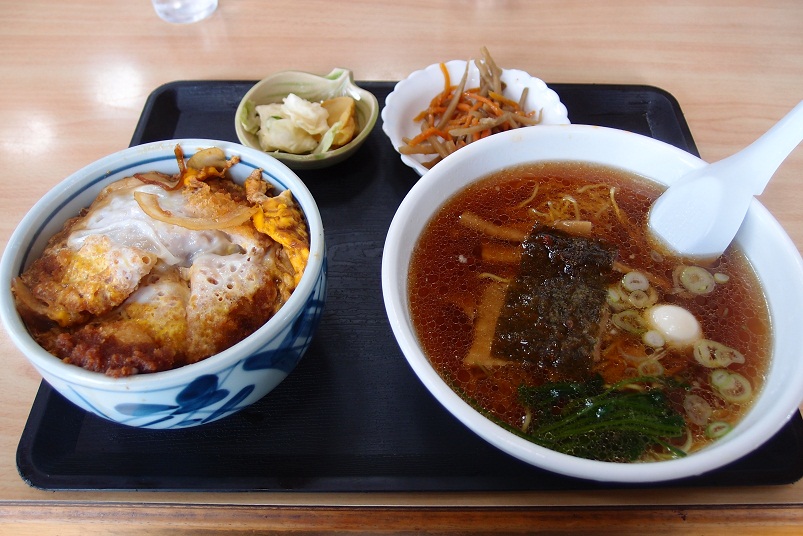 カツ丼、半ラーメン、小鉢、漬物のセット。