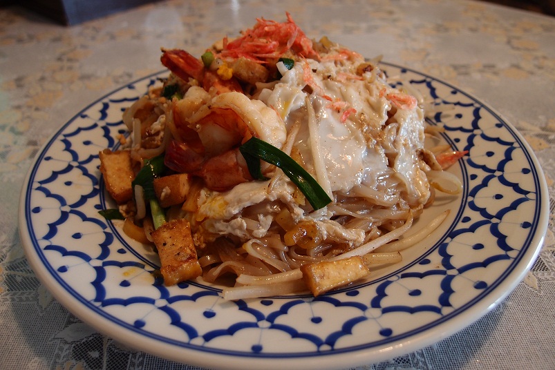 炒めた麺の上に玉子焼き、シャキシャキもやし、野菜、厚揚げ、木の実、干し海老が載ったタイ風焼きそばです。とにかく具がたくさん入っていました。