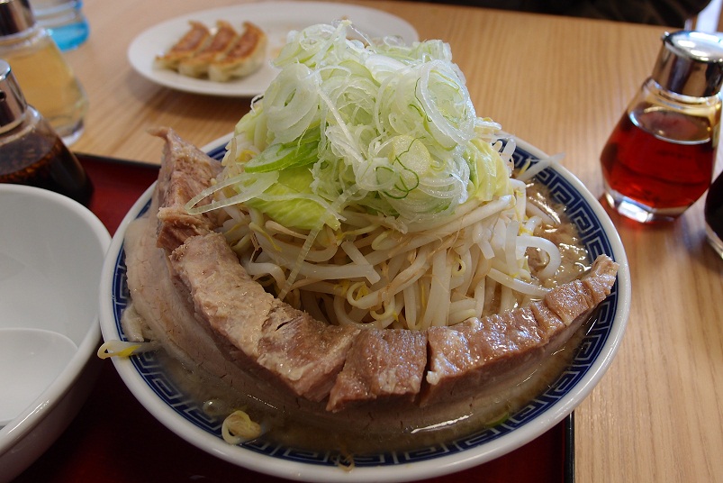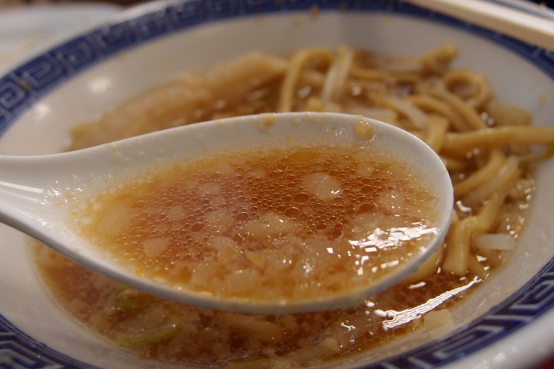 スープは甘味のある醤油味。多めの背脂とニンニクたっぷりです。頂上のネギが多いのも得点高めです。