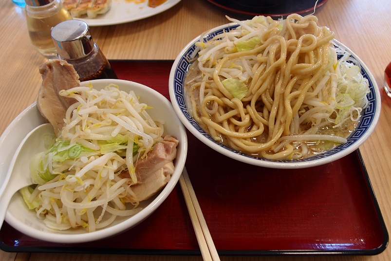 若干小さめのドンブリにモヤシが山になったラーメン登場。ドンブリの縁にドデカイチャーシュが見事です。