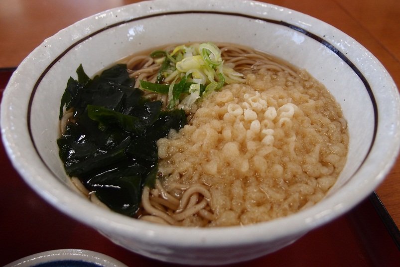 ワカメと天かす、ネギの載ったシンプルな蕎麦。