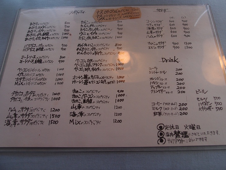 ミートソースにしようか、ウニにしようか、ベーコンと卵にしようか迷いました。