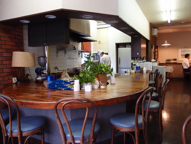 時代を感じる店内は年季の入った丸みのあるカウンター席がキッチンを囲みます。カウンター席に座ればご主人の調理する姿が目の前です。
