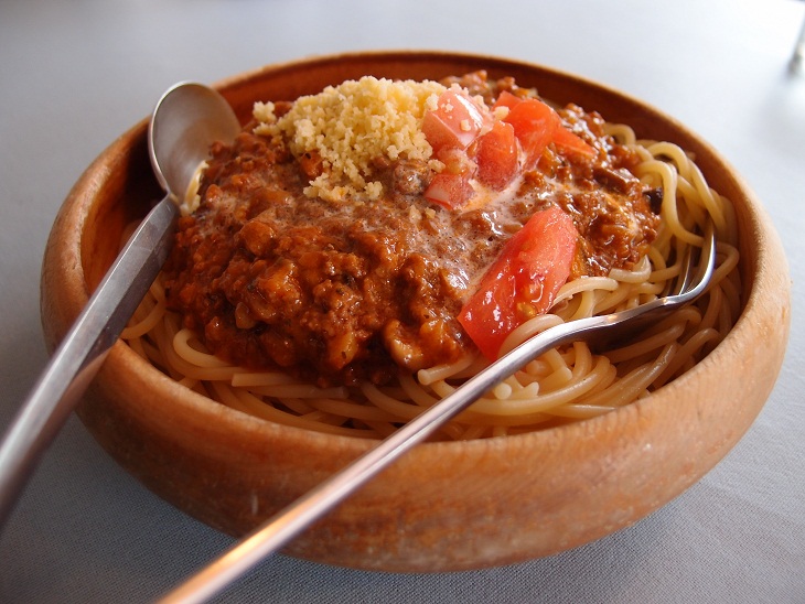 木製のボウルに入ったスパゲッティがやってきました。フォークとスプーンは麺の脇に添えられて(笑)
