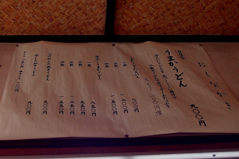 メニューは壁の上の方に貼られており、自信作のうまかうどんを筆頭に冷やしうまかうどん、つけめんたぬきうどん、冷やしたぬきうどんがあります。