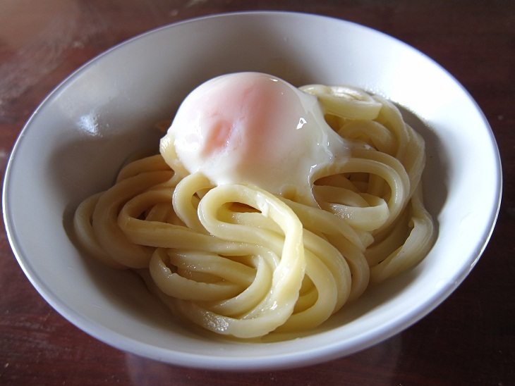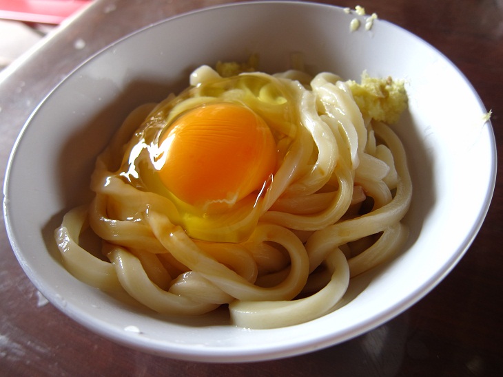 うどんをてぼで自分で温め、自分で温玉を割り入れ生醤油をかけました。先ほど言ったようにネギはなく、生姜はおろすのが面倒でパス(笑)