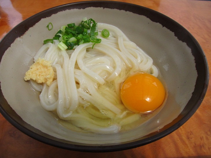 釜から直接うどんがドンブリに入れられ生卵を入れてクルリと混ぜられ青ネギが載せられ渡されました。