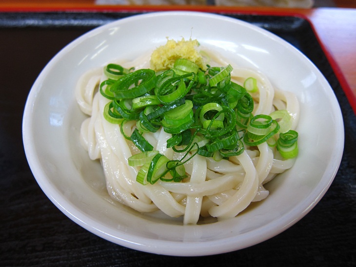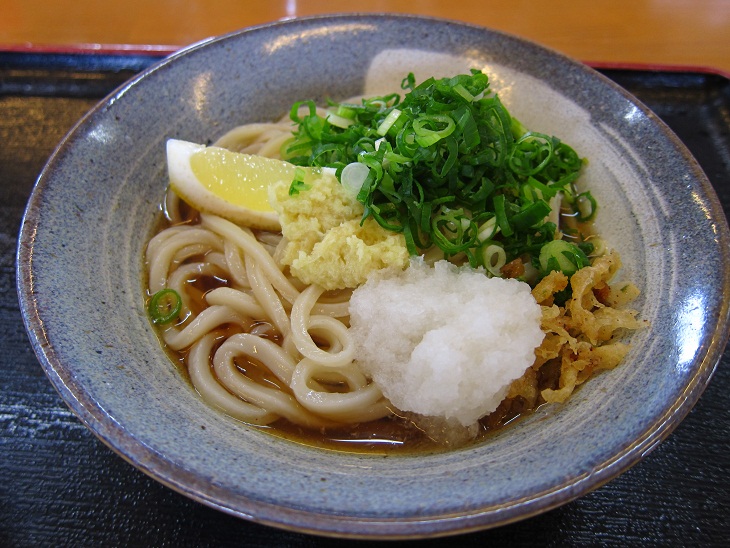 冷たいうどんに濃い目のだしをかけたモノ。セルフでネギ、おろししょうが、大根おろし、天かす、レモンをのせました。