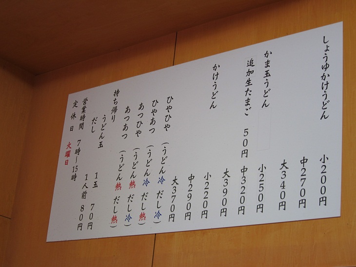 うどん小150円、うどん大250円、ちくわ60円、てんぷら50円、あげ50円、生卵40円、温玉90円・・・価格は安いです!