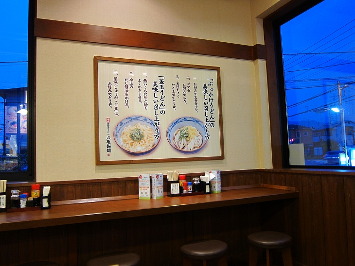 はじめて丸亀製麺に来ました。大きな店舗で座敷、テーブル席、窓際にカウンター席がありとてもきれいな店内です。